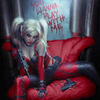 blonde hair styled into pigtails. Harley Quinn is holding a gun in one hand and has a smirk on her face, as if posing for the picture. The background suggests
