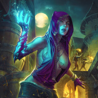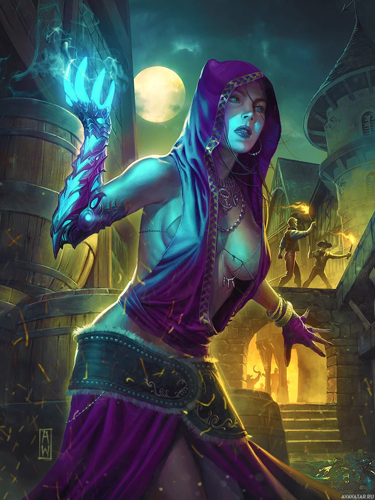 mystical abilities. The setting looks like a dark alleyway or street within a medieval or fantasy town, with buildings and structures in the background that are reminiscent of
