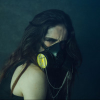 The image shows a woman wearing a respirator mask. She has dark hair and is looking directly at the camera with a serious expression on her face. There are no other notable objects or texts present in the picture.