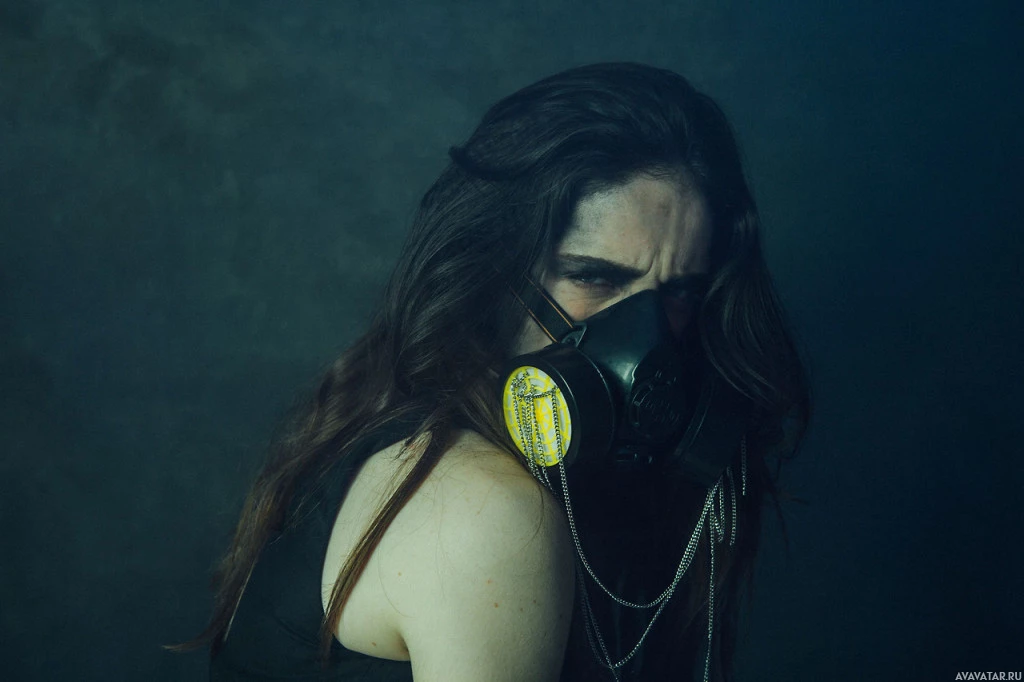 На снимке изображена женщина в маске респиратора. У нее темные волосы и она смотрит прямо в камеру с серьезным выражением лица. На картине нет других заметных предметов или текстов.