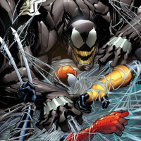 a comic book featuring the characters Spider-Man and Venom. In the picture, Spider-Man is in the foreground with his hands gripping onto something, possibly part of his web or another object. Behind him, we can see Venom, who appears to be wrapped in Spider-Man's web or caught up in