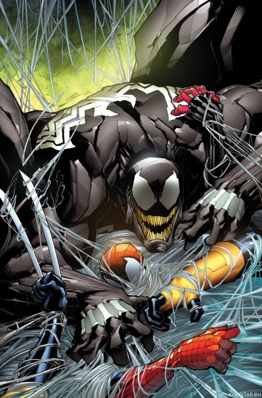 a sticky substance that resembles Spider-Man's web fluid. The background is quite chaotic with various elements such as webs and possibly other debris from their encounter. This image captures an intense moment between the two characters, likely part of an action sequence from the comic