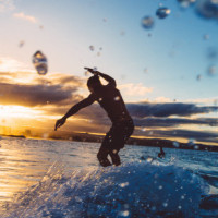 the ocean at sunset. The individual is wearing a wetsuit and is crouched on a surfboard, riding a wave towards the shore. The sky is painted with hues of orange and blue due to