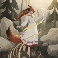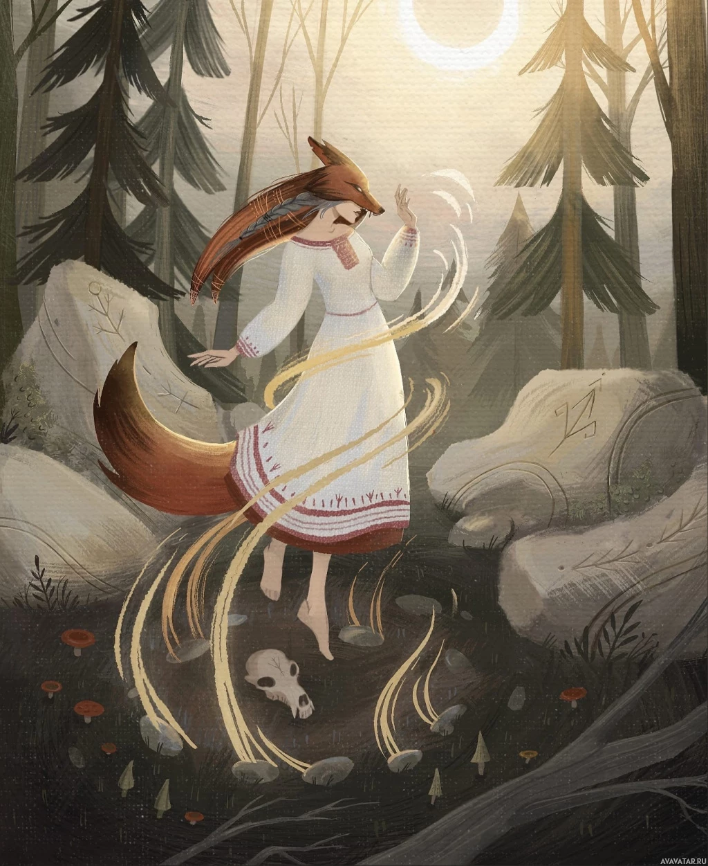 The image shows a fantasy-themed illustration. In the center, there is a character with an anthropomorphic fox appearance; the character has long, flowing fur and