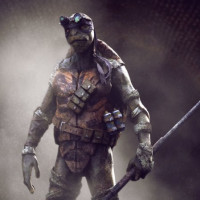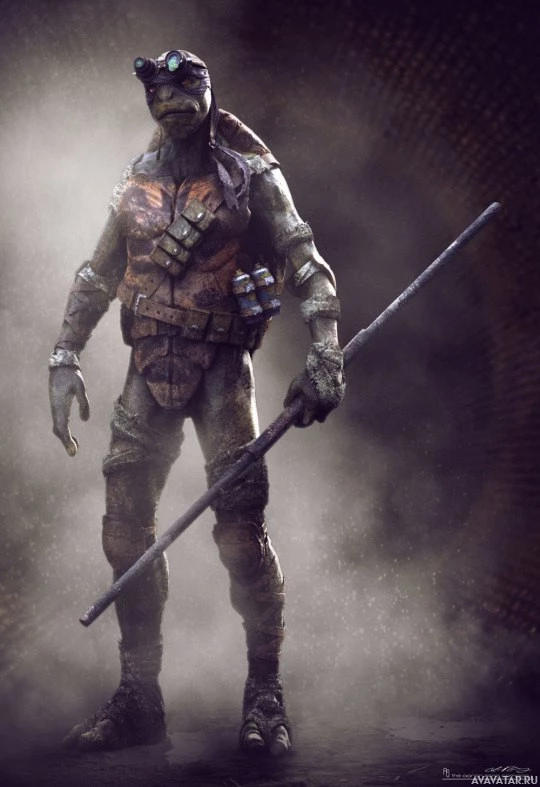 Mutant Ninja Turtles franchise, known as Donatello. He is portrayed in a stylized and somewhat grim manner, which might indicate that this is an artistic representation or an alternate design for the character rather than a direct portrayal from