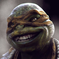 The image depicts Michelangelo, a character from the Teenage Mutant Ninja Turtles. He is known for his distinctive green mask and white eye areas, as well as his signature nunchuck weapon and his happy-go-lucky personality.