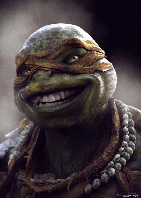 На картинке изображен Микеланджело, персонаж из Черепашек-ниндзя. Он известен своей отличительной зеленой маской и белыми глазами, а также своим фирменным оружием нунчака и своей счастливой личностью.