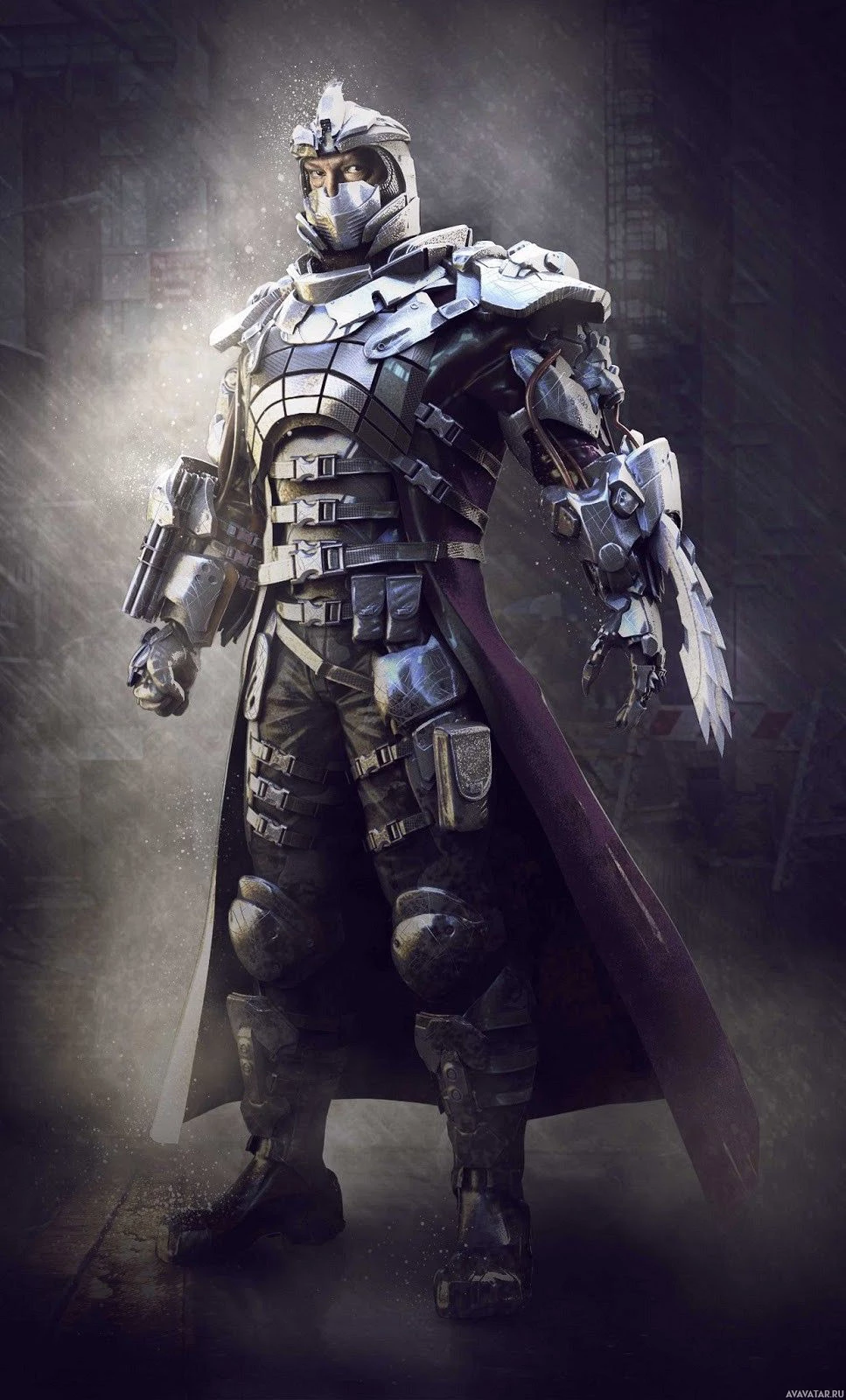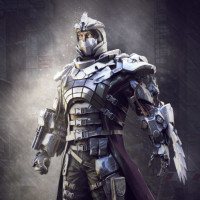 armored suit with a helmet featuring sharp, angular designs. The suit has intricate details and textures suggesting