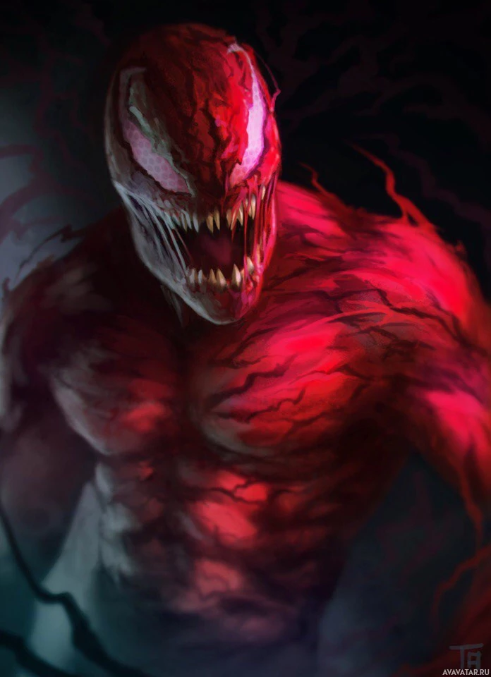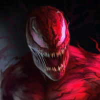 a menacing expression, which are characteristic features often associated with this villainous alter ego of Cletus Kasady, who has multiple powers such as superhuman strength, agility, and durability. The art style suggests that it may be a conceptual or fan-made illustration rather than an official Marvel representation.