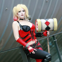 Harley Quinn, a character from the DC Comics universe. The individual is wearing a costume that resembles Harley Quinn's iconic red and black outfit, which includes a corset-like top, shorts with fishnet stockings, boots, and accessories such as gloves, a belt, and what appears to be