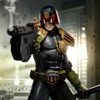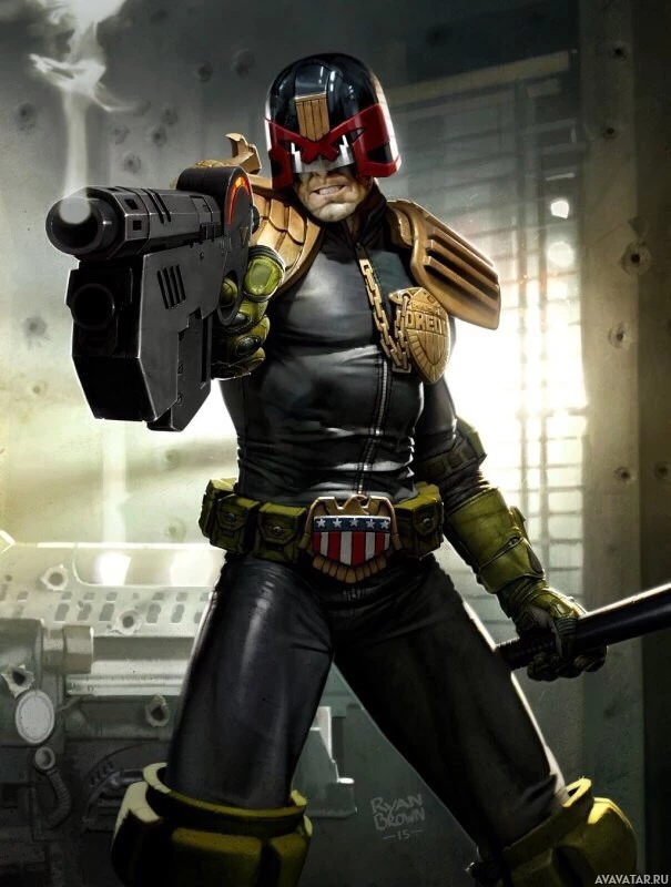 The image depicts a character known as Judge Dredd from the 2000 AD comic