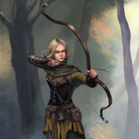 long hair and is holding a bow, ready to shoot an arrow. The setting suggests a forest or