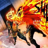 skull mask and flames surrounding him, which is indicative of his abilities in the game. The other character is also engaged in the fight, with a fiery backdrop that enhances