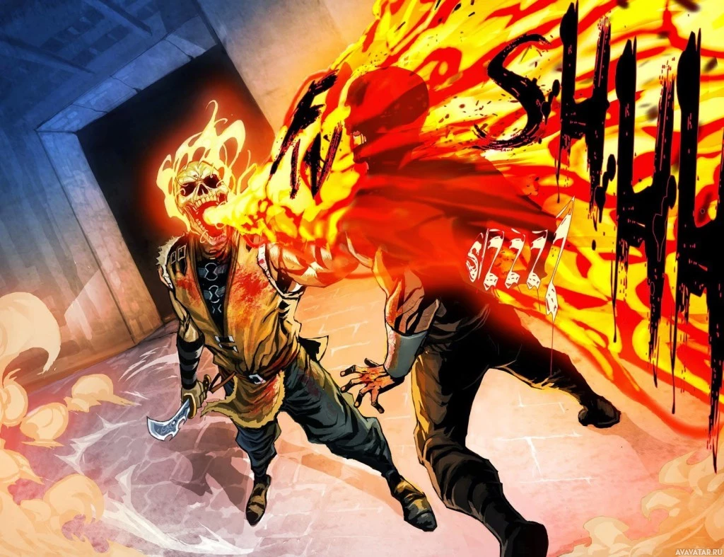 Kombat series, featuring two characters in combat. One character appears to be Scorpion, identifiable by his characteristic