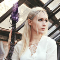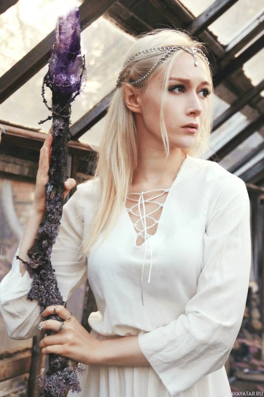 a contemplative expression on her face and is holding a staff that appears to have a purple crystal at its tip. She's wearing what seems to be a fantasy or elf-inspired costume, including