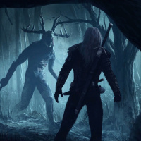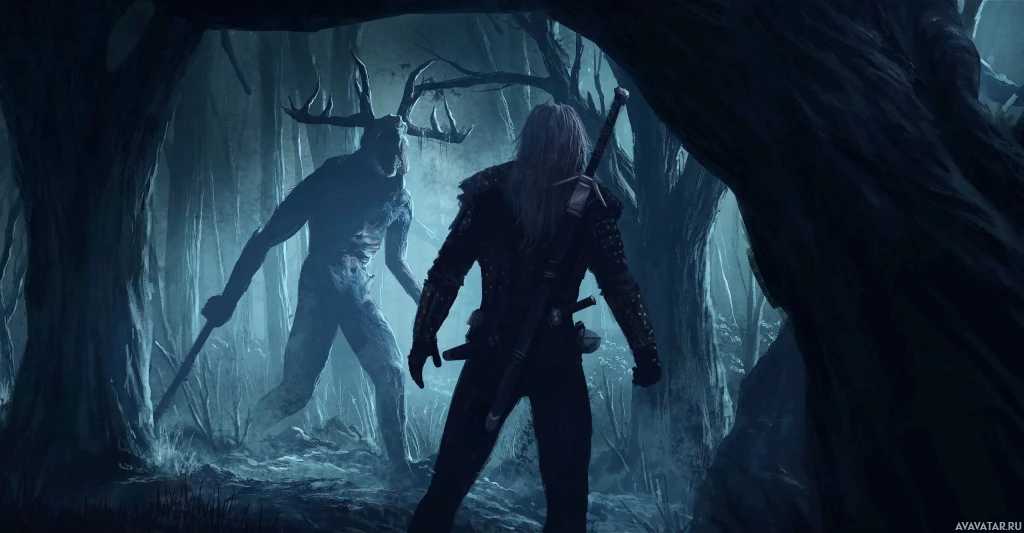 the video game "The Witcher 3: Wild Hunt." It features two characters in