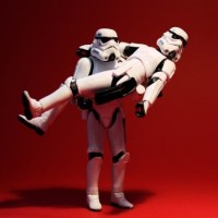 the Star Wars franchise. One figure is being carried by the other as if it were injured or incapacitated. There is