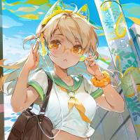 an urban setting with buildings that have bright blue walls and yellow detailing. The character also has a large headband adorned with what looks like