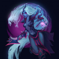 intricate armor, while her left hand holds what looks like a magical staff or weapon. The background features a purple and blue gradient with a circular symbol in the center, suggesting