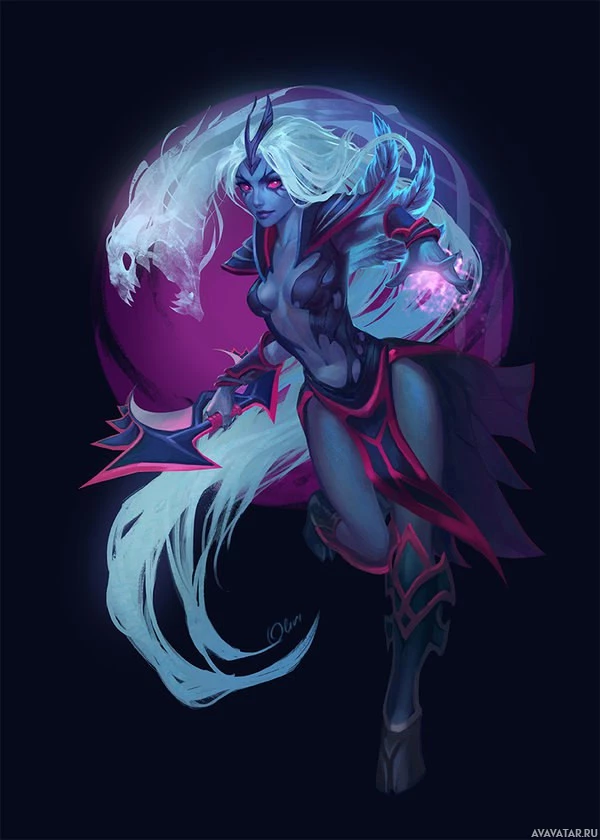 The image depicts an illustration of a character from the game "Dota 2." This character is known as