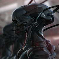 an industrial setting, possibly a factory or workshop, given the presence of machinery and pipes in the background. The overall atmosphere of the picture suggests a futuristic or dystopian theme, often associated with