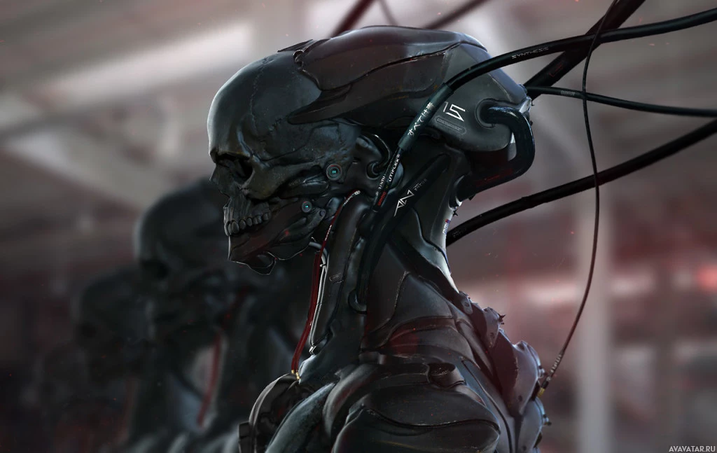 skull for a head, which is an unusual and striking design element. The robot appears to be in