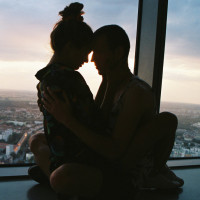 The image shows two silhouetted figures in an embrace, with one person seemingly holding the other. They are situated near a window that provides a view of a cityscape at what appears to be either sunrise or sunset due to the warm glow on the horizon. The atmosphere suggests a moment of intimacy and love shared between the individuals against the backdrop of an urban skyline.