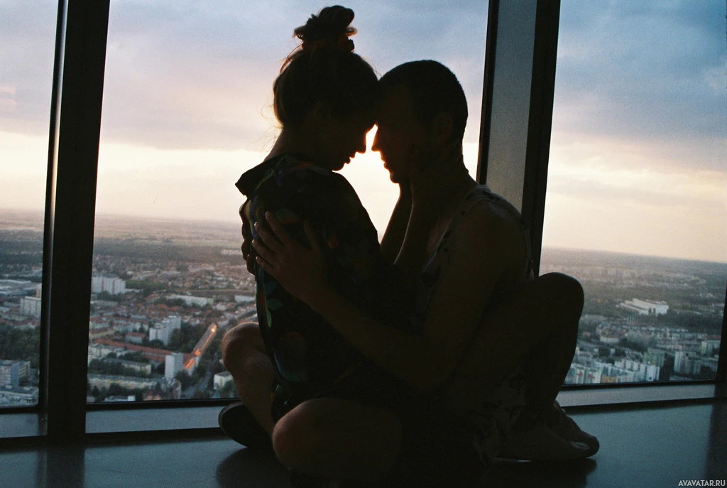 На картинке изображены две силуэтные фигуры в объятиях, причем один человек, похоже, держит другого. Они расположены рядом с окном, которое обеспечивает вид на городской пейзаж на то, что кажется либо восходом солнца, либо закатом из-за теплого свечения на горизонте. Атмосфера предполагает момент близости и любви между людьми на фоне городского горизонта.
