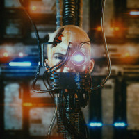 a science fiction scene featuring a robot with a human-like face. This robot is equipped with mechanical and electronic components that are visible on its head, which suggests