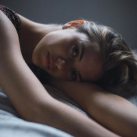 The image depicts a young woman lying down with her head resting on her hand. She appears to be gazing away from the camera and has a serene expression on her face. Her posture is relaxed, suggesting she might be in a moment of rest or contemplation.