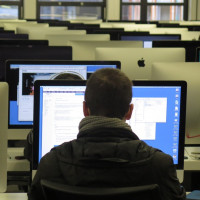 an indoor setting with multiple workstations, each equipped with a computer monitor. At least one person is visible in the background, seated at a desk and facing away from the camera. The computers appear to be Apple brand, as indicated by the logo on the monitors. The environment suggests this could be an office or