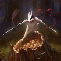 a fantasy scene featuring an anthropomorphic animal, which appears to be a fox or wolf-like creature, standing on its hind legs with a sword in each hand. This creature is surrounded by other figures that look like animals as well, suggesting a magical or mythical setting. The background has a dark and mysterious quality, possibly hinting at a forest or