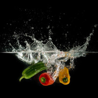 the bright colors of the peppers and the white water spray.