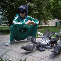 numerous pigeons that seem to be gathering around her, possibly attracted by food she may have offered them. The environment suggests