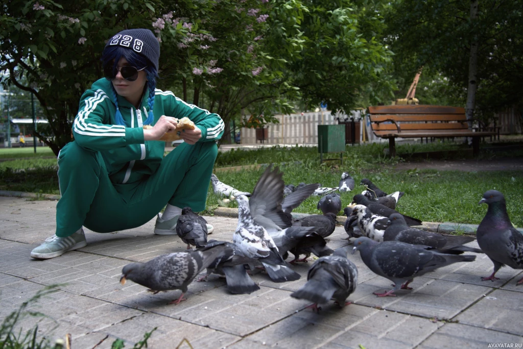 The image shows a person, presumably female due to the sunglasses and hairstyle, squatting on what appears to be a patio or courtyard with