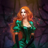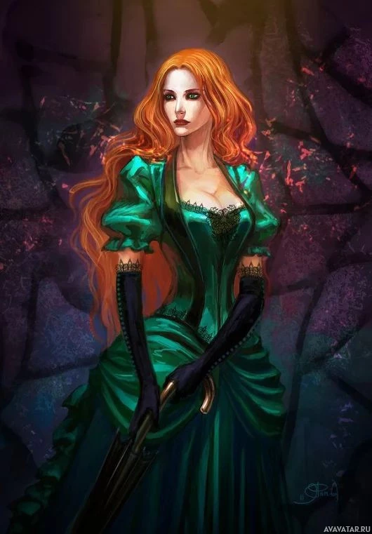 red hair. She is dressed in