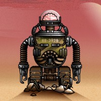 a barren landscape resembling a desert. The robot has a mechanical appearance with various tubes and wires, indicative of its