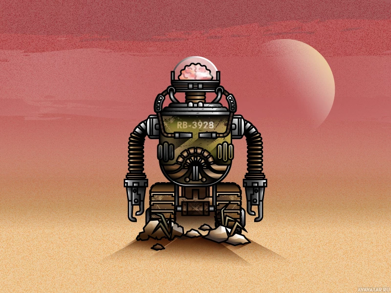 The image features a robot that appears to be from the game "Fallout." It's depicted in an artistic style, standing on what seems to be