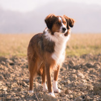 a thick coat that suggests it may be a breed such as a Collie or Australian Shepherd, which are known for their double coats. The lighting suggests either