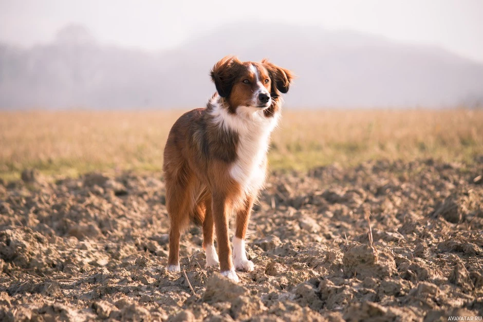 countryside setting, with soil and what seems like freshly plowed earth around the dog. The dog has