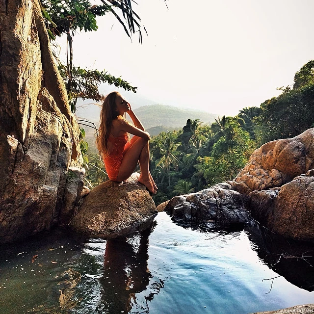 an orange top and appears to be looking up towards the sky or into the distance. Her posture suggests she might be relaxing or contemplating. Surrounding her are lush green plants and rocks, indicating that this could be