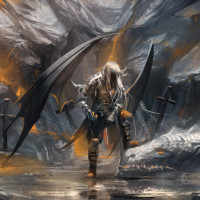 a fantasy scene with a warrior standing in the foreground. This character is armored and holding a staff or spear, suggesting they are prepared for battle. In the background, there appears to be a fiery,
