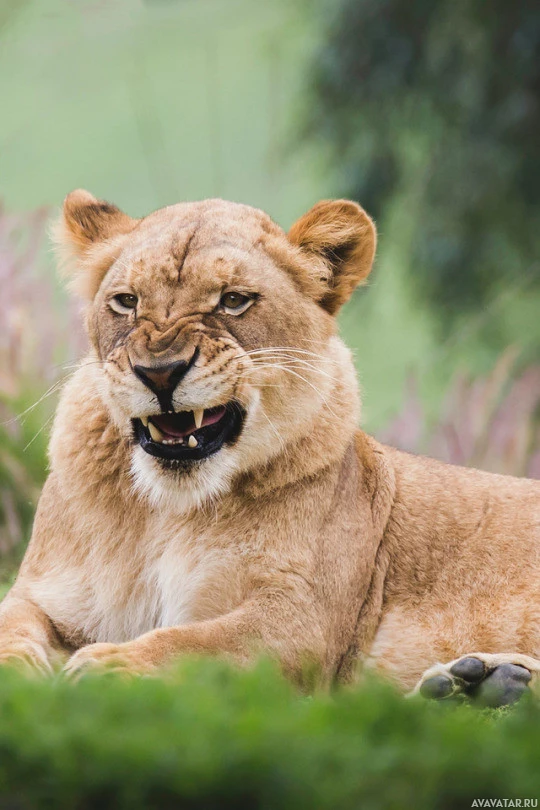На картинке изображен лев, сидящий в траве, с кустом, частично скрывающим лицо. Лев, по-видимому, отдыхает или, возможно, проявляет некоторые признаки агрессии, поскольку он издает ревущий звук с открытым ртом.