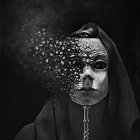 a religious iconography, possibly suggesting themes of identity, masks (both literal and metaphorical), and introspection. The use of