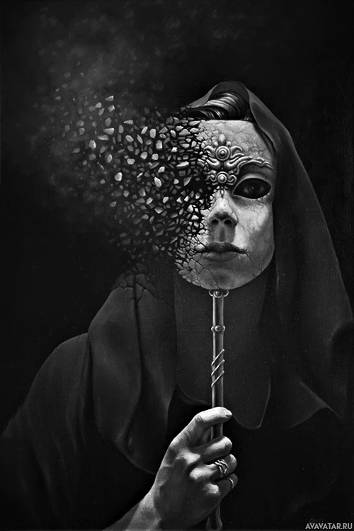 dark colors and the broken mask could symbolize a shattered facade or the complexity of human identity.