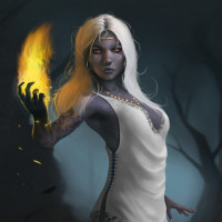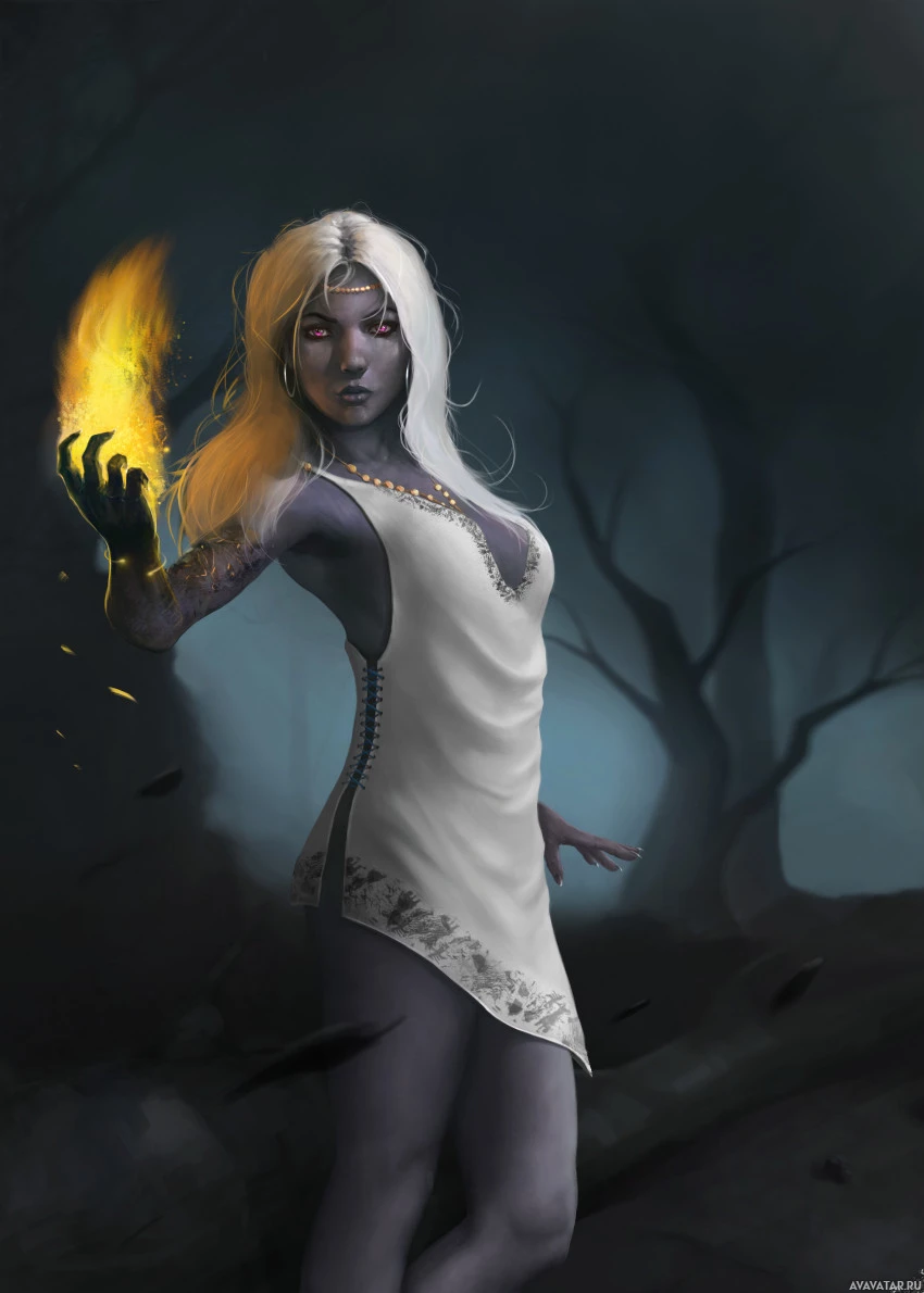 white hair, which is a common trait for the drow, as well as an ethereal appearance. They are holding a flame or fire in their hand, suggesting they have some control over