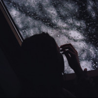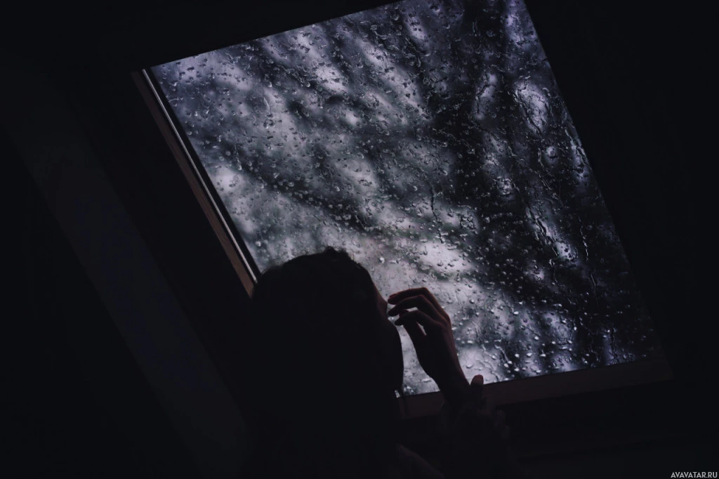 The image shows a person sitting by a window, looking out at the rain. It appears to be a gloomy or stormy evening, with raindrops visible on the glass. The person is partially obscured by the darkness and their head is resting on their hand. There is a slight blurriness to the image that might suggest the photo was taken in low
