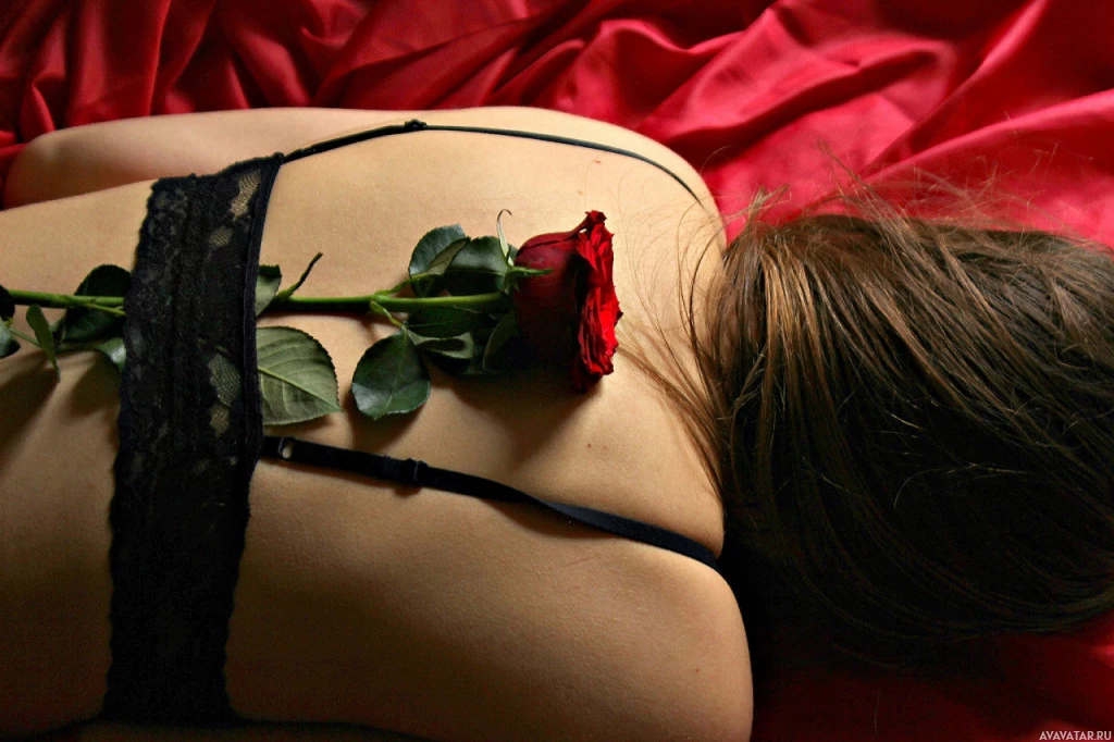 The picture shows a person lying on their stomach with their head turned to the side. On their back, there is a red rose with its stem and leaves attached to it. The image has been altered or filtered in a way that gives it