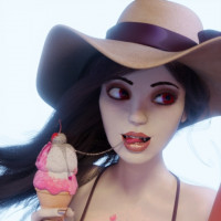 an ice cream cone in her left hand. The character has a somewhat eerie look, with pale skin and