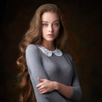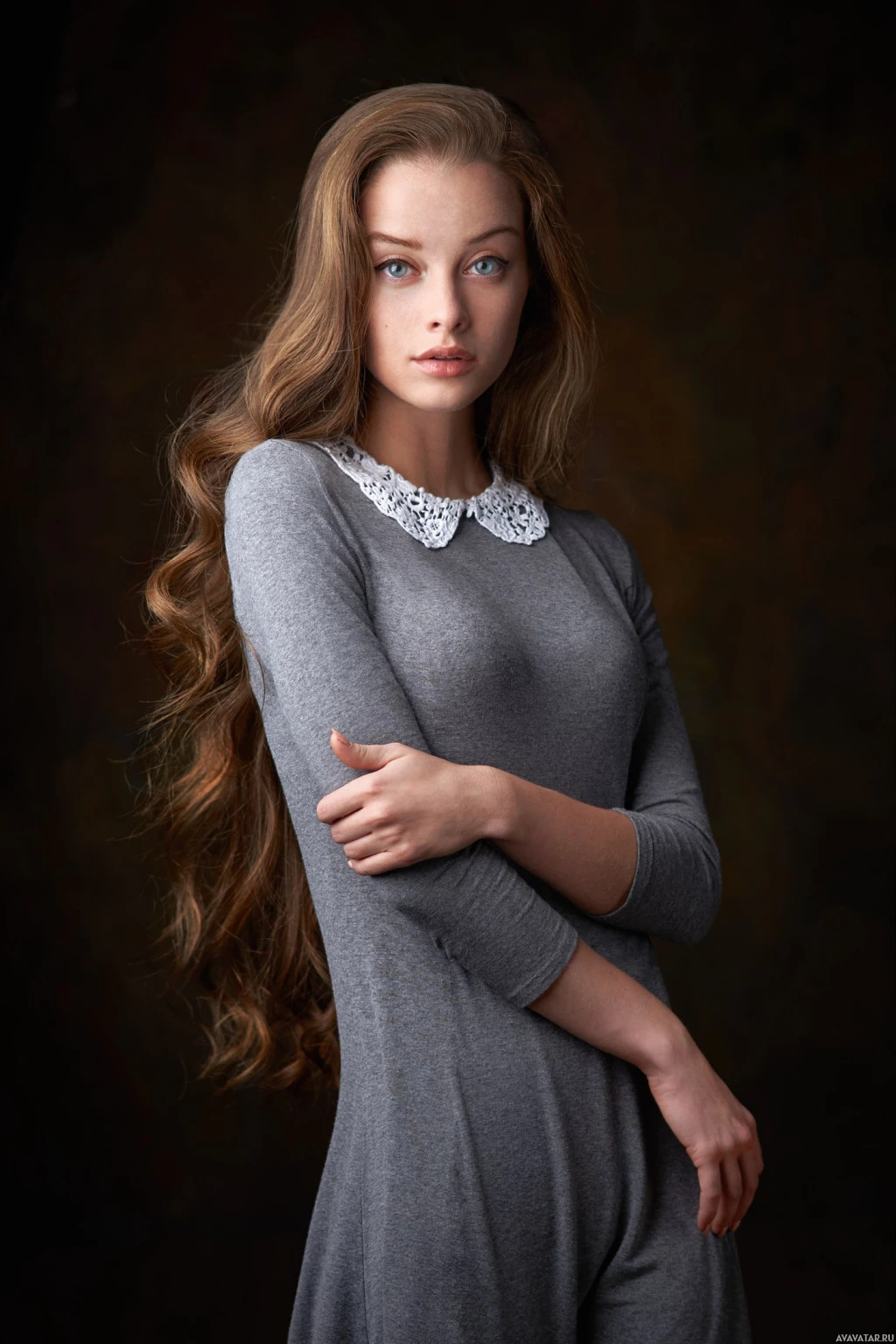 wavy hair and is wearing a long-sleeved dress with a round neckline, reminiscent of a classic style. Her hands are clasped together in front of her, and she has